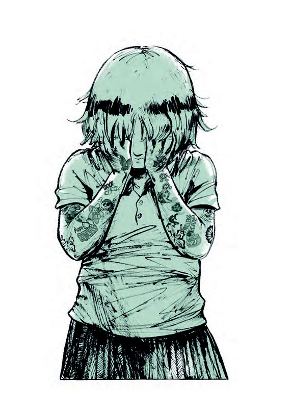 The colour scheme felt in keeping with the atmosphere of the story, essentially black and white, offset by a muted green throughout. I may be overthinking this but I did wonder if the green used was intended to mimic a faded bruise, even though it was a softer and prettier green on the screen I viewed the graphic novel on than a bruise is.